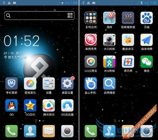 在系统方面,大Q手机Q1不仅预装了Android4.2操作系统,同时还搭载了腾讯出品的Q立方智能手机桌面。系统桌面采用了应用平铺一体式的设计风格,机身内部的所有程序都展现在桌面上,支持文件夹分类管理。接下来,笔者就为大家展示下它的系统界面。