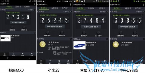 测试结果可以看出搭载三星Exynos 5410处理器的MX3和搭载高通骁龙800的三星LTE-A能力相仿,而Tegra 4的中兴U988S成绩更胜一筹。小米2S的成绩最低也属于正常现象,它搭载的处理器定位就要稍低于其它三款。目前搭载三星Exynos 5410、高通骁龙600、800的机器均已上市,而搭载Tegra 4的首款手机还未上市。处理器主频越高不一定越好,还与处理器架构、优化等有着密切的联系。尽管魅族MX3在性能方面被没有表现出压倒性的竞争优势,甚至在和高通骁龙800以及Tegra 4芯片的手机相比还有些落后,但是整体来看,MX3觉得达到了顶级旗舰手机的水平也具备和三星GALAXY S4一决高下的实力。