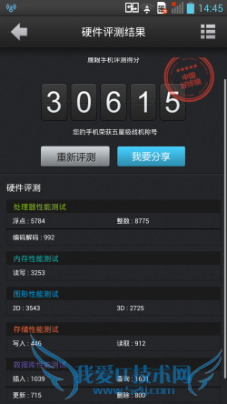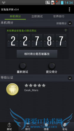 超级兔子系统评测AnTuTu Benchmark是一个专门给Android系统的手机、平板电脑硬件跑分的软件,它能一键运行完整测试项目,通过内存性能、CPU整数性能,CPU浮点性能、2D、3D绘图性能、数据库I/O、SD卡读、写速度等多项性能测试,并对手机的整体和单项硬件性能做出评分。同时上传分数并查看该设备在世界的排名。
