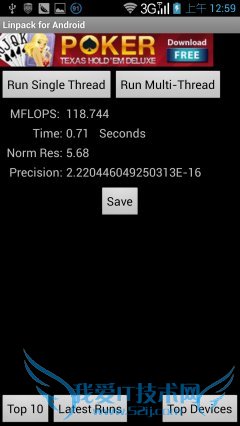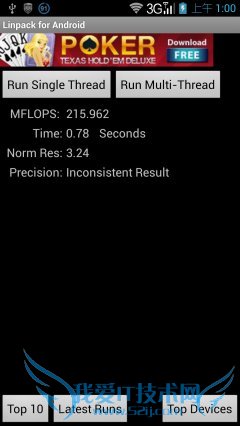 Linpack在国际上已经成为最流行的用于测试高性能计算机系统浮点性能的benchmark。通过利用高性能计算机,用高斯消元法求解一元N次稠密线性代数方程组的测试,评价高性能计算机的浮点性能。相对电脑而言,Android手机版的Linpack软件相对简化了一些,最新版只包含单线程与多线程两种测试。顾名思义,处理器的运算能力越强,分数就越高,双核甚至未来的多核处理器的优势,在多线程测试部分来有所体现,测试结果以浮点运算每秒(Flops)给出。
