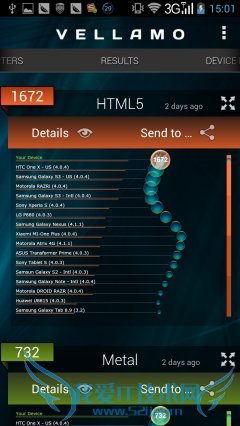 VellamoVellamo是由Qualcomm(高通公司)开发的一个基准测试应用(类似于Neocore),它可以让你对手机浏览器的性能及稳定性进行测试,包括像Java脚本性能、渲染、联网和用户界面等。该工具的结果同样包括多个子项,但我们只取总成绩,分数越高则表明手机对浏览器的优化程度越高,网页浏览体验更好。