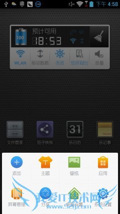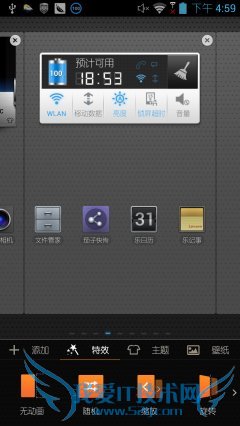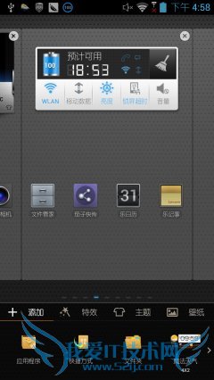 在主界面时,如果我们按下屏幕下方的设置键就会弹出一个小菜单,基本上与之前长按桌面弹出的菜单类似,我们可以在这里进行添加桌面与壁纸,还可以管理屏幕。另外,联想K900最多只支持用户添加九个主屏幕页面。
