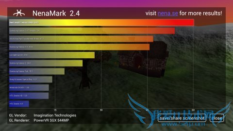 NenaMark是一款面向Android智能手机的图形处理能力测试工具,通过一段视频Demo的播放测试手机图形处理单元的硬件加速能力。其中Nenamark1适用于所有运行Android 2.x版本系统的终端;Nenamark2则适用于装备PowerVR SGX 540及以上图形芯片的高端Android设备。