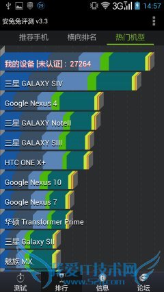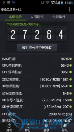 联想K900在AnTuTu上最终得分为27264,这是一个非常惊人的成绩了。Z2580虽然是颗双核处理器,但是其整体性能,尤其是软件测试得分却完全压过三星Exynos 5410 4+4核处理器。
