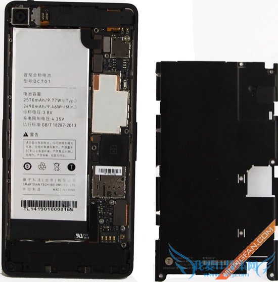 将后盖拿掉之后,我们看到了锤子手机(SmartisanT1)的内部结构。