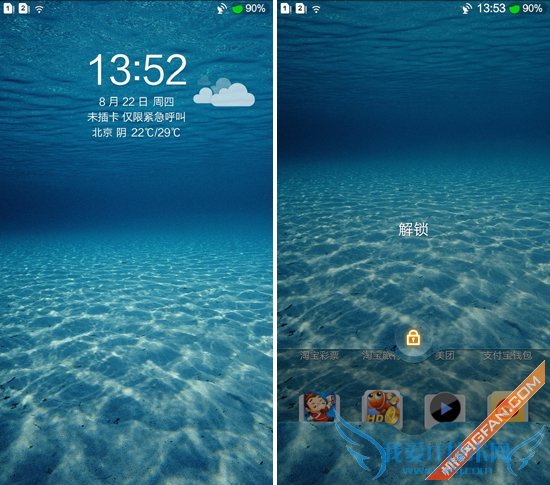 以上是卓普大黑C7的锁屏、解锁界面,从图中可以看出云OS 2.0与Android有着非常明显的区别,云OS的锁屏集成了云端天气服务,可以直接在锁屏界面下显示当日天气情况。解锁方式也非常方便,只需上滑屏幕即可完成解锁操控。