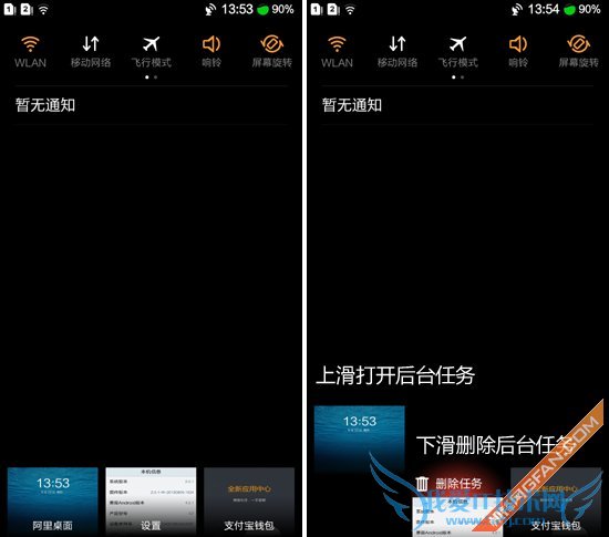 在通知中心和任务管理上,卓普大黑C7也拥有独特的设计。云OS将通知中心和任务管理进行了融合设计,下拉顶部状态栏即可进入到通知中心,上段是快捷操控图标、中间是通知中心、下方是任务管理器。