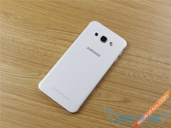 后背的设计比较平淡,尽管其实是采用金属的材质,但质感不是很出色的涂层让人会误以为是塑料材质,跟设计精良的前面板与边框不是很搭配,也是笔者认为整机中比较不出彩的地方。后背边缘有一定的弧度,背面靠上圆角矩形的摄像头两旁分别是扬声器和LED闪光灯,中下部分别是三星的Logo和一些认证信息,不过A8的摄像头基本没有凸出机身是一个比较让人欣慰的地方。