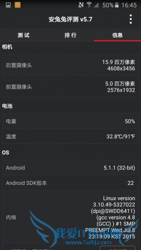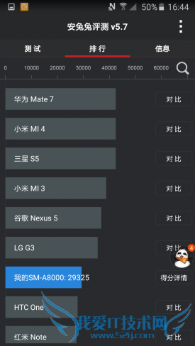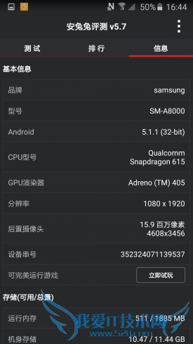 性能其实对于现在的手机来说已经逐渐不再是最具吸引力的字眼了,毕竟对于普通用户来说,基本的功能和娱乐在现在的手机性能下已基本都可以完成,综合实力和续航能力也许才是现在用户更在意的点,三星Galaxy A8应该就是定位于此。Galaxy A8采用了1.5GHz八核心64位高通骁龙615处理器,集成了Adreno405的GPU,搭配2GB RAM算是比较主流,不过这款CPU是以低功耗和不错的性能著称的,不管怎样,老规矩先跑个分。