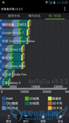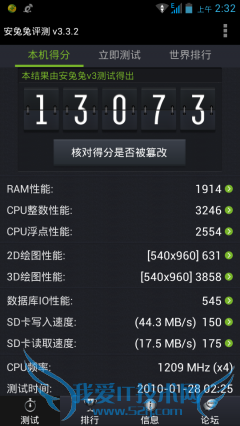 超级兔子系统评测AnTuTu Benchmark是一个专门给Android系统的手机、平板电脑硬件跑分的软件,它能一键运行完整测试项目,通过内存性能、CPU整数性能,CPU浮点性能、2D、3D绘图性能、数据库I/O、SD卡读、写速度等多项性能测试,并对手机的整体和单项硬件性能做出评分。同时上传分数并查看该设备在世界的排名。
