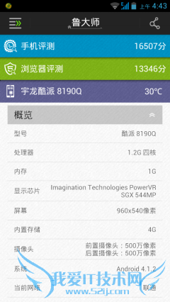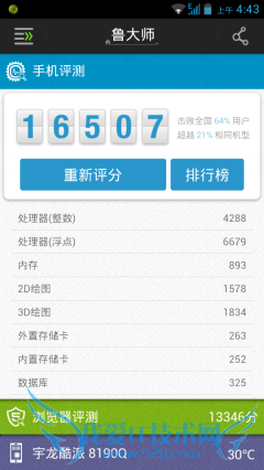 酷派8190Q在鲁大师手机版上的最终得分16507,同安兔兔一样鲁大师给出的性能得分也让我们看到了酷派8190Q不错的表现。