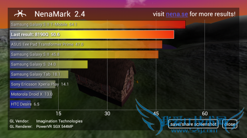 NenaMark是一款面向Android智能手机的图形处理能力测试工具,通过一段视频Demo的播放测试手机图形处理单元的硬件加速能力。其中Nenamark1适用于所有运行Android 2.x版本系统的终端;Nenamark2则适用于装备PowerVR SGX 540及以上图形芯片的高端Android设备。
