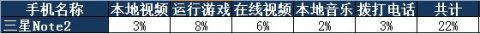 三星GALAXY Note2 N7108D配备了一块3100mAh大容量电池。电池续航测试包括播放本地视频、运行游戏、播放在线视频、播放本地音乐、拨打电话五个项目,每个测试项目均为30分钟。开始电量为100%,在每一项测试开始和结束时记录电量百分比,最后看剩余电量。测试期间屏幕亮度调整为50%,插入耳机音量同样调整为50%。此外,首先使用移动4G卡待机,开启WIFI上网,未开启数据交换。由于手中的4G测试卡不能拨打电话,所以通话测试环节换上了移动2G卡进行续航测试。