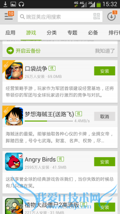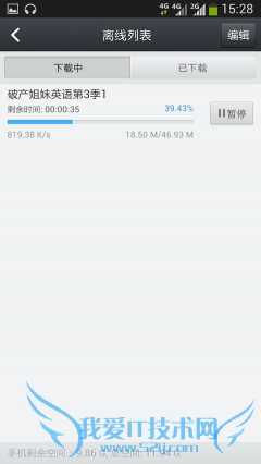 之后又使用百度视频下载了一段视频,均速在800KB/s,然而使用豌豆荚下载应用时,出现了4.4M/s的最高速度。
