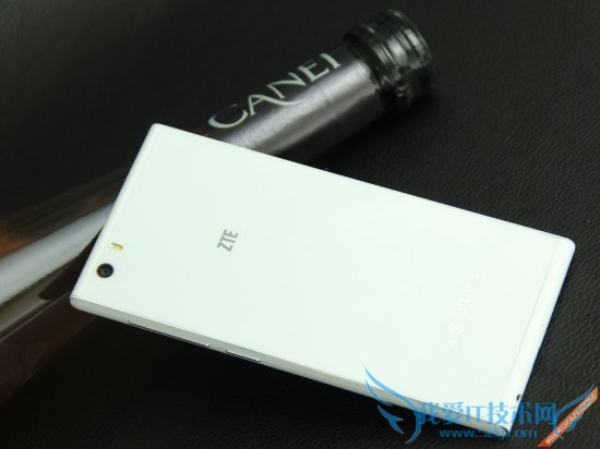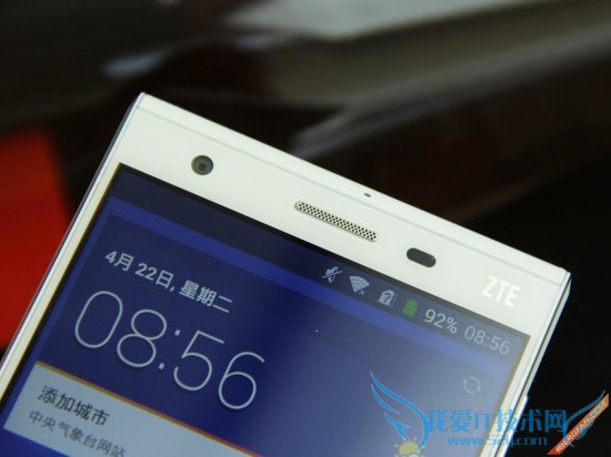 机身上方的设计非常简单,从左到右分别为指示灯、前置500万摄像头、听筒以及感应器,而旁边则为中兴"ZTE" LOGO标示。