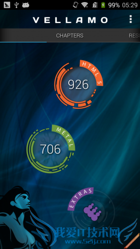 Vellamo是由Qualcomm(高通公司)开发的一个基准测试应用(类似于Neocore),它可以让你对手机浏览器的性能及稳定性进行测试,包括像Java脚本性能、渲染、联网和用户界面等。该工具的结果同样包括多个子项,但我们只取总成绩,分数越高则表明手机对浏览器的优化程度越高,网页浏览体验更好。
