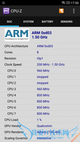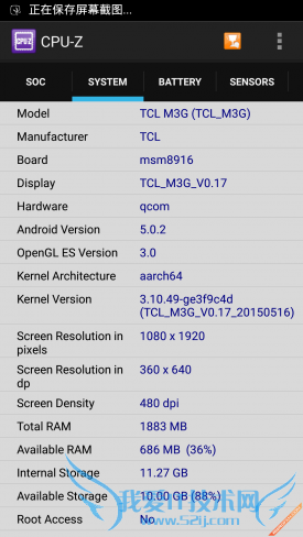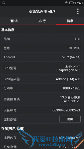 硬件配置方面,TCL么么哒3S作为一款售价仅799元的千元产品,该机搭载了高通骁龙615八核64位处理芯片,Adreno405图形处理器,同时辅以2GB RAM+16GB ROM内存组合,从性价比的角度来看,么么哒3S可以说是非常给力了。但实际表现又是如何呢?我们还是通过一组跑分测试来实际检测一下。
