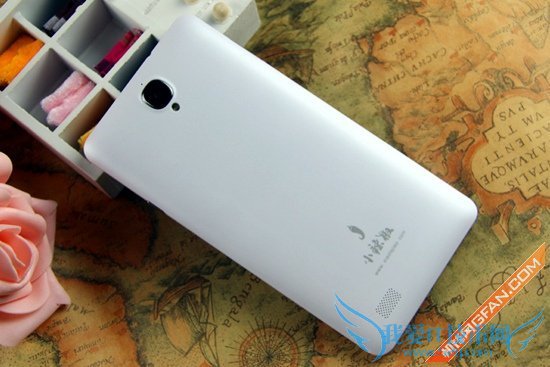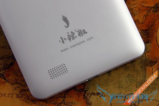 机身背面的设计很是简洁,采用一体式可拆卸的白色后盖,塑料材质铸造而成。在后盖上端是后置1300万像素的高清摄像头,配备一枚单LED补光灯;后盖下方是小辣椒的品牌标志和独立扬声器。
