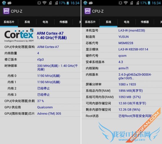高通骁龙MSM8228四核处理器:采用四核心Cortex-A7架构设计,主频为1.4GHz,28nm工艺制造,高通宣称其相比其它四核A7处理器来说能够省电30%。MSM8228搭载的GPU型号为Adreno 305,频率为450MHz,在此前的MSM8930上我们已经见过这款GPU,其支持1080p屏幕额1300万像素摄像头,相比Adreno 220来说性能最高可提升50%。