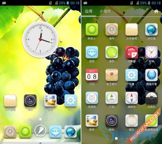 系统主页:采用Android4.3原生桌面设计,由桌面+应用抽屉两个大页面组成,在桌面上可以摆放应用程序图标和小工具,而应用抽屉里则是手机中的全部应用程序,在这里可以快速找到我们安装的第三方程序。