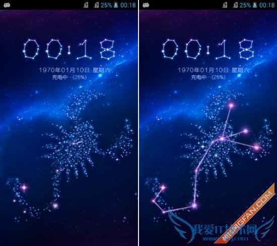 锁屏界面:采用了非常新颖的星空设计,时间采用了星阵排列,解锁的方式非常独特,只需滑动锁屏中央的天蝎座,完成星阵排列即可解锁进入系统。