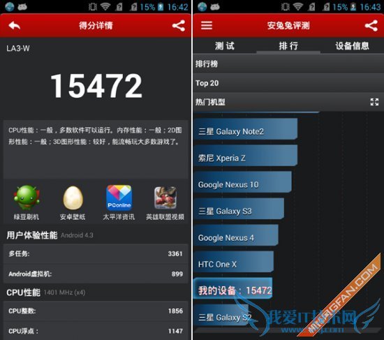 安兔兔是一款专门给Android设备的手机评分的软件,目前最新版是V4.0版,新版的安兔兔能够一键完成,UE测试(多任务与虚拟机)、CPU整体性能测试、RAM内存测试、2D/3D图形性能测试以及数据存储I/O的性能检测。通过安兔兔评测,你可以获得设备的单项与整体得分,借此判断硬件的性能水准。安兔兔得分:15472。