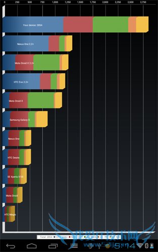 Quadrant是一款元老级的移动设备性能测试工具,它所测试的范围包括12项CPU测试、1项内存测试、4项I/O测试、1项2D图形处理测试、3项3D图形处理测试,并最终反馈一个被测试设备的综合成绩。分数高达2854分,位列第一。