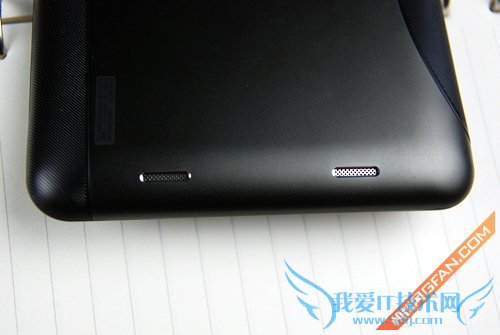 机身背面为灰、黑色,上下两端有斜条纹防滑设计,上方为ViewSonic标志字样。右侧为双扬声器。