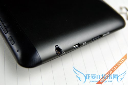 机身左侧无设计。右侧依次为3.5mm耳机插孔、Micro USB接口、Micro SD卡槽。