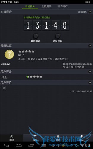 安兔兔系统评测AnTuTu Benchmark是一个专门给Android系统的手机、平板电脑硬件跑分的软件,它能一键运行完整测试项目,通过内存性能、CPU整数性能,CPU浮点性能、2D、3D绘图性能、数据库I/O、SD卡读、写速度等多项性能测试,并对手机的整体和单项硬件性能做出评分,同时上传分数并查看该设备在世界的排名。13140的高分,四核名副其实,跑分轻松过万。