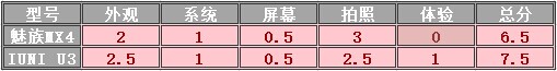 总结:两者可以说互有胜负,魅族MX4在颜色方面输掉了0.5分,而IUNI U3则在可视度方面输掉了0.5分,所以两款产品均得分也是0.5分。