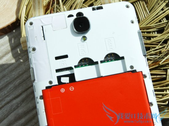 打开后壳,可以看到共有三个卡槽,从左至右分别为micro SD卡槽、标准SIM卡1、标准SIM卡2,卡1支持联通3G、2G和移动2G,卡2支持联通、移动2G网络,并且标准卡免去了用户剪卡的繁琐。