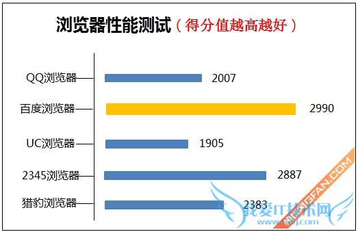 Peacekeeper test做浏览器性能的综合测试,包括影像、游戏、WebGL 2D/3D、JS、DOM Tree等。该项测试中,分数越高代表浏览器综合性能越好。跑分最高的是百度浏览器2990分,紧随其后的是2345浏览器2887分。