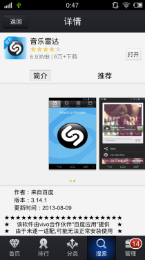 首先是发现音乐,除了和常规手机一样可以通过手机自带的应用商店下载音乐之外,vivo X3还支持音乐雷达功能,它通过声音的方式进行搜索,类似于微信的摇一摇搜歌功能,听到喜欢的音乐,想知道名字的时候直接打开音乐雷达它就可以帮你完成查找。