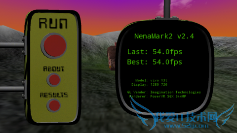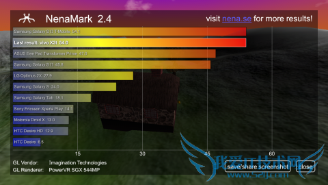 NenaMark2是一款用于Android设备的硬件加速基准测试程序,通过演示一款实时渲染的画面来对手机的图形能力进行测试,包括反射、动态阴影、曲面参数、复杂光线模式等内容,需要Android 2.0以上系统和OpenGL ES 2.0支持。一般超过38 fps,就可以运行大型3D游戏了,测试结果vivo X3得分54.0fps。