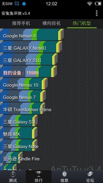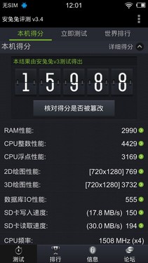 安兔兔系统评测AnTuTu Benchmark是一个专门给Android系统硬件跑分的软件,它能一键运行完整测试项目,通过内存性能、CPU整数性能,CPU浮点性能、2D、3D绘图性能、数据库I/O、SD卡读、写速度等多项性能测试,对手机的整体和单项硬件性能做出评分,同时上传分数并查看该设备在世界的排名。测试结果vivo X3得分15988分。