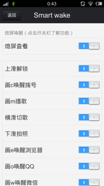 最后最重点的Smart wake功能。所谓Smart wake,就是在屏幕未被点亮且属于锁屏状态的情况下,通过在屏幕上划特定的符号,而直接打开所需要的应用,目前可以通过上划直接解锁、下划直接进入相机、画C直接进入拨号界面、画M直接播放音乐、画W直接进入微信、画O直接打开QQ,画E直接打开浏览器等等。