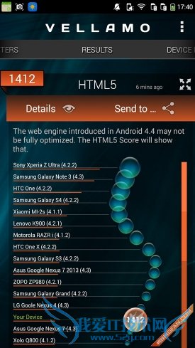 VELLAMO测试:是一款网页基准评测,该软件可以评估Android设备上的浏览器性能。Vellamo为浏览器的性能和稳定性提供了一个全面的评分,包括网络,脚本,渲染,和用户体验。结合行业标准和定制测试最后以分数形式来表现一款Android设备在网络浏览方面的能力。