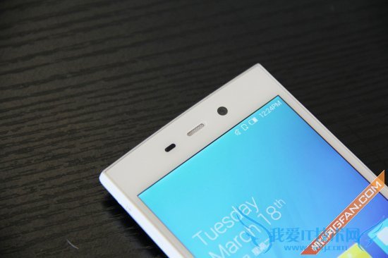 从正面看,IUNI U2的风格较为硬朗,笔直的边框线条很规矩的将前面板玻璃,牢牢的控制在已经非常成熟的设计理念中。机身正面的边框由塑料和金属组成,IUNI U2应该在制作工艺上下了非常大的功夫,塑料与金属配合的十分紧密,接缝处没有出现因为材质不同而导致的自然缝隙。而且金属边缘还使用了专门的金属切割工艺,在彰显质地的同时也将手机的整体质感提升到了一个新的高度。