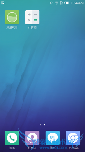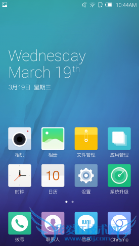 在完成解锁操作后,桌面图标和时钟会非常灵动的伴随着简单的动画效果,抖动着出现在用户眼前。IUNI OS没有使用二级菜单,所有程序都直接摆放在桌面上。IUNI OS没有预装任何第三方程序,所以整个系统桌面十分简洁,再配合上系统默认的壁纸,清新之风铺面而来。而且IUNI OS对系统的优化十分到位,界面的滑动和操作都十分流畅。