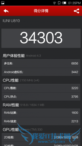 从跑分数据上来看,IUNI U2的整体实力完全属于机皇级别。在日常使用它时,因为系统与硬件的完美结合,所以很多时候我们可以忽略掉它本身的硬件参数,而是全身心的体验IUNI U2出色的人机交互性。