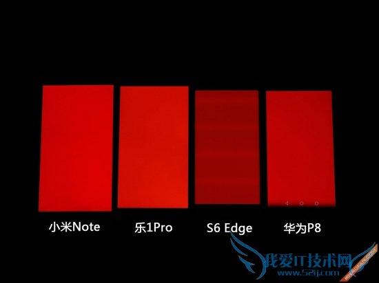 在屏幕评测部分,我们主要进行红绿蓝三色的色彩还原以及多阶色彩的可视角度进行测试。测试方法是将四款手机放在全黑的光线条件下使用相机进行翻拍。测试条件则是四款手机的亮度均调到最高。