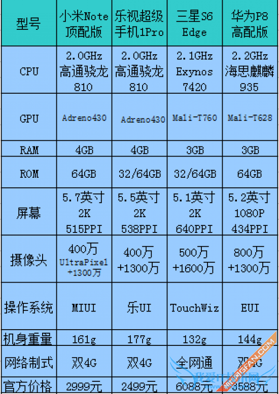 价格:乐1Pro>小米Note顶配版>华为P8>S6 Edge