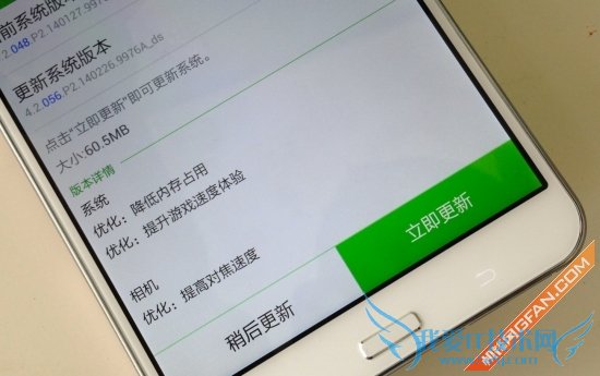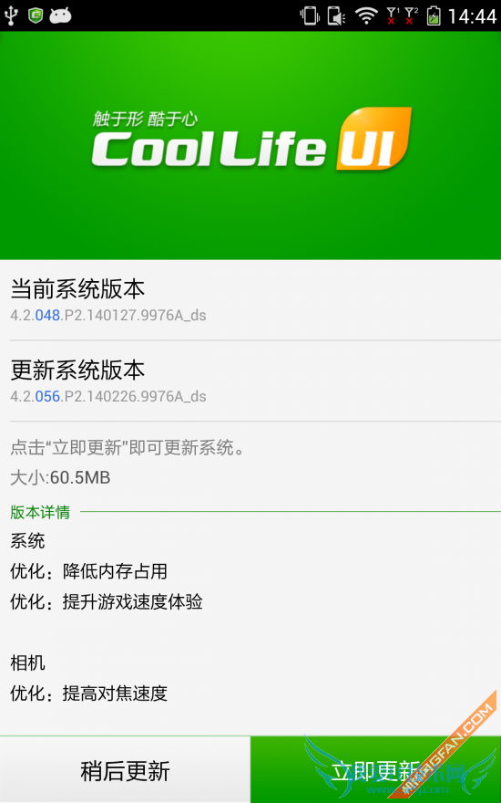 目前,笔者手上的酷派大神内置系统版本是4.2.048.P2.140127.9976A-DS,而更新系统版本则是4.2.056.P2.140127.9976A-DS,OTA升级文件为60.5MB大小,同时在该页面中还显示出了本次升级的版本详情。整体来看,界面直观、操控简单。