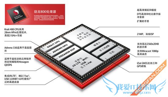 骁龙800系列处理器配备四核Krait 400 CPU,在骁龙S4 Pro处理器的基础上,性能提升最高达75%,并将制程技术进一步提升到28纳米HPm(High Performance for mobile,高性能移动计算)技术节点,功耗更低。GPU配备了升级的Adreno 330,相较上一代Adreno 320 GPU,图形处理性能提升最高达50%。支持OpenGL ES 3.0、DirectX、OpenCL、Renderscript Compute和FlexRender™等先进的图形和计算接口(API)。