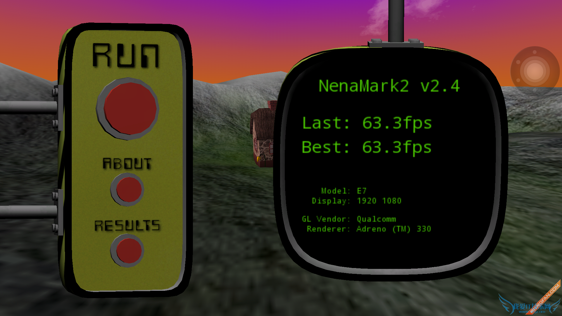 NeanMark2测试:是一款用于Android设备的硬件加速基准测试程序,通过演示一款实时渲染的画面来对手机的图形能力进行测试,包括反射、动态阴影、曲面参数、复杂光线模式等内容,需要Android 2.0以上系统和OpenGL ES 2.0支持。NeanMark2测试成绩:63.3fps。