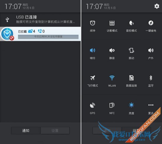 通知中心:采用双页面设计,默认打开的是通知页面,点击屏幕右上角按钮,即可跳转至第二页,在这个页面主要分布着手机快捷设置按钮,包含:飞行模式、电池电量、WLAN、热点、蓝牙等。