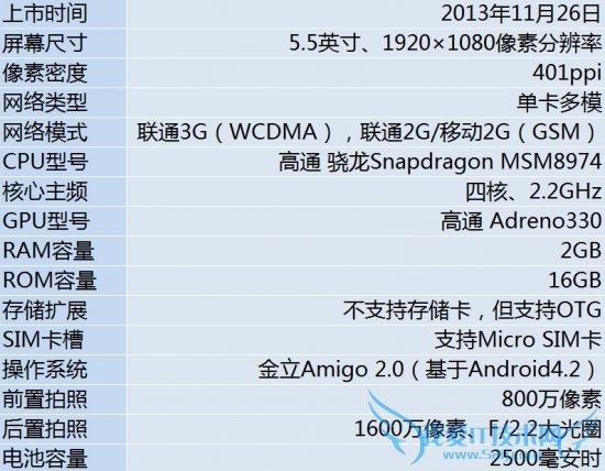 ELIFE E7作为金立手机的2013年度旗舰产品,在网络上拥有三种制式版本,内存上也拥有两种存储版本。笔者拿到的评测样机是WCDMA版,内存2GB RAM+16GB ROM,接下来先为大家简单展示下该机的基本信息:5.5英寸触控显示屏、1080P分辨率;高通骁龙800四核处理器、2GB RAM+16GB ROM;前置800万、后置1600万像素双摄像头;电池2500毫安时、内置不可拆卸;网络支持GSM+WCDMA单卡多模;系统运行Amigo 2.0,基于Android4.2的定制UI。