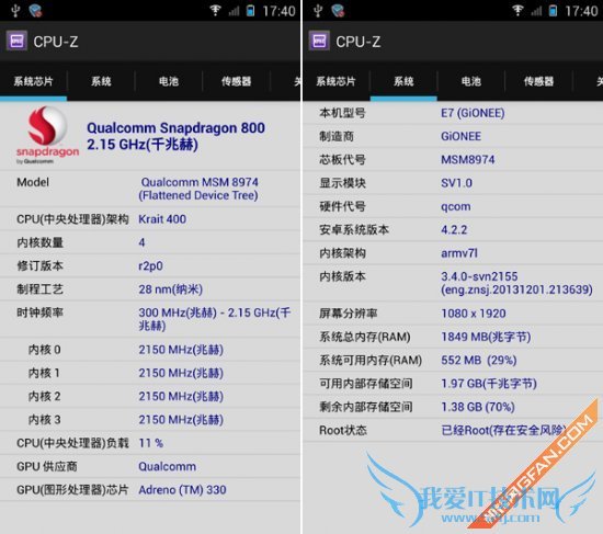 相信用过金立手机的消费者都应该很清楚,在E7之前的金立手机大部分都采用了联发科处理器方案,虽然价格上相对低廉,但在性能上却无法满足如今的消费者需求。金立为了迎合用户的高性能追求,所以为ELIFE E7配备了高通骁龙800处理器(WCDMA版采用骁龙800 8974),主频为2.2GHz,该系列处理器是美国高通公司旗下骁龙移动处理器系列的最新产品,也是目前骁龙家族中最高端的产品。