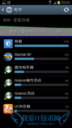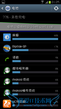 在30分钟运行《激流快艇》游戏测试中,三星GALAXY NoteII由100%满电减少到94%,消耗6%电量。大可乐2代由100%减少至90%,耗电10%。